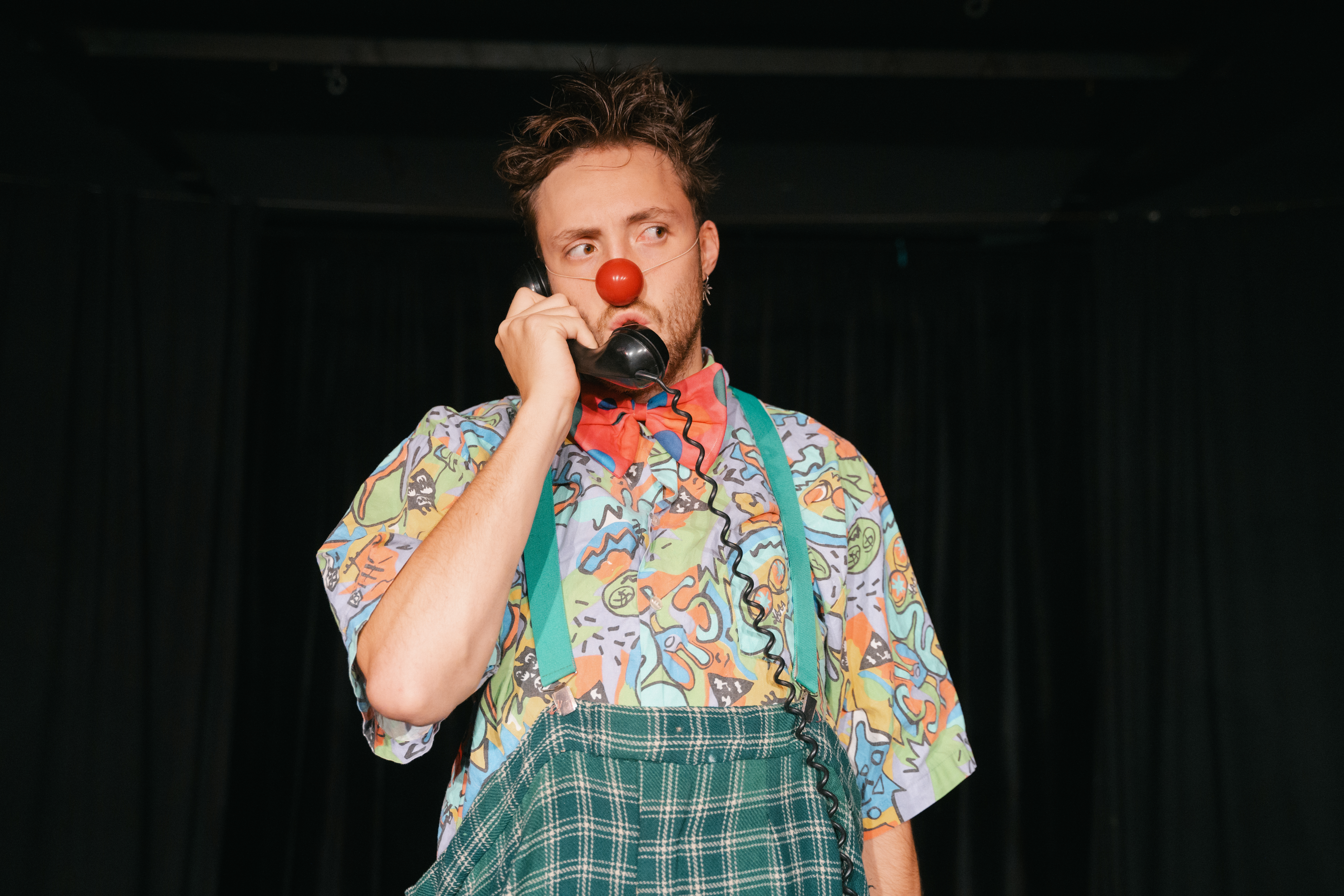 Worüber wundert er sich bloß? Etwa über eine solche klitzekleine Kleinigkeit, wie es der Luftballon eine ist? Um dies zu verstehen, muss man wissen, dass der Clown in einer Situation steckt, wo jede Kleinigkeit zum großen Problem wird. Er soll nämlich an Stelle des verhinderten Direktors eine Vorstellung geben! Für Kinder! Also gut, er probiert’s. Aber ach! Sosehr er sich auch bemüht, die Hindernisse beginnen schon bei den alltäglichen Dingen und hören natürlich nicht auf, wenn es ungewöhnlicher und komplizierter wird. Wo ein Spazierstock schon solche Schwierigkeiten macht, was soll man da erst von einem Zauberstab erwarten?! Von Besen, Telefonen, Jonglierbällen, Stellwänden usw. ganz zu schweigen. Umso erstaunlicher, wenn am Ende wie zufällig doch ein paar Sachen gelingen. Gar nichts aber würde funktionieren ohne die Kinder. Sie belehren, protestieren, verbessern und lachen ihn aus, und sie lösen seine Schwierigkeiten. So wird aus dem Ganzen doch noch ein Clownspektakel.